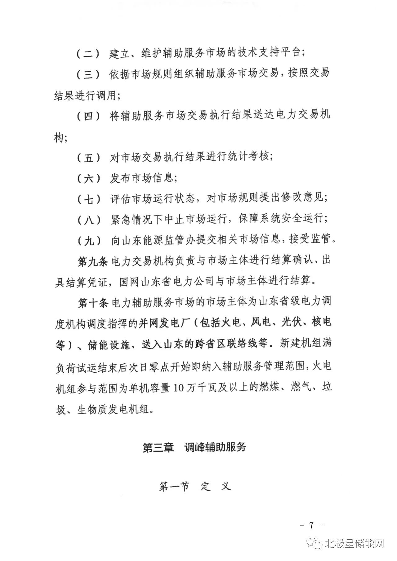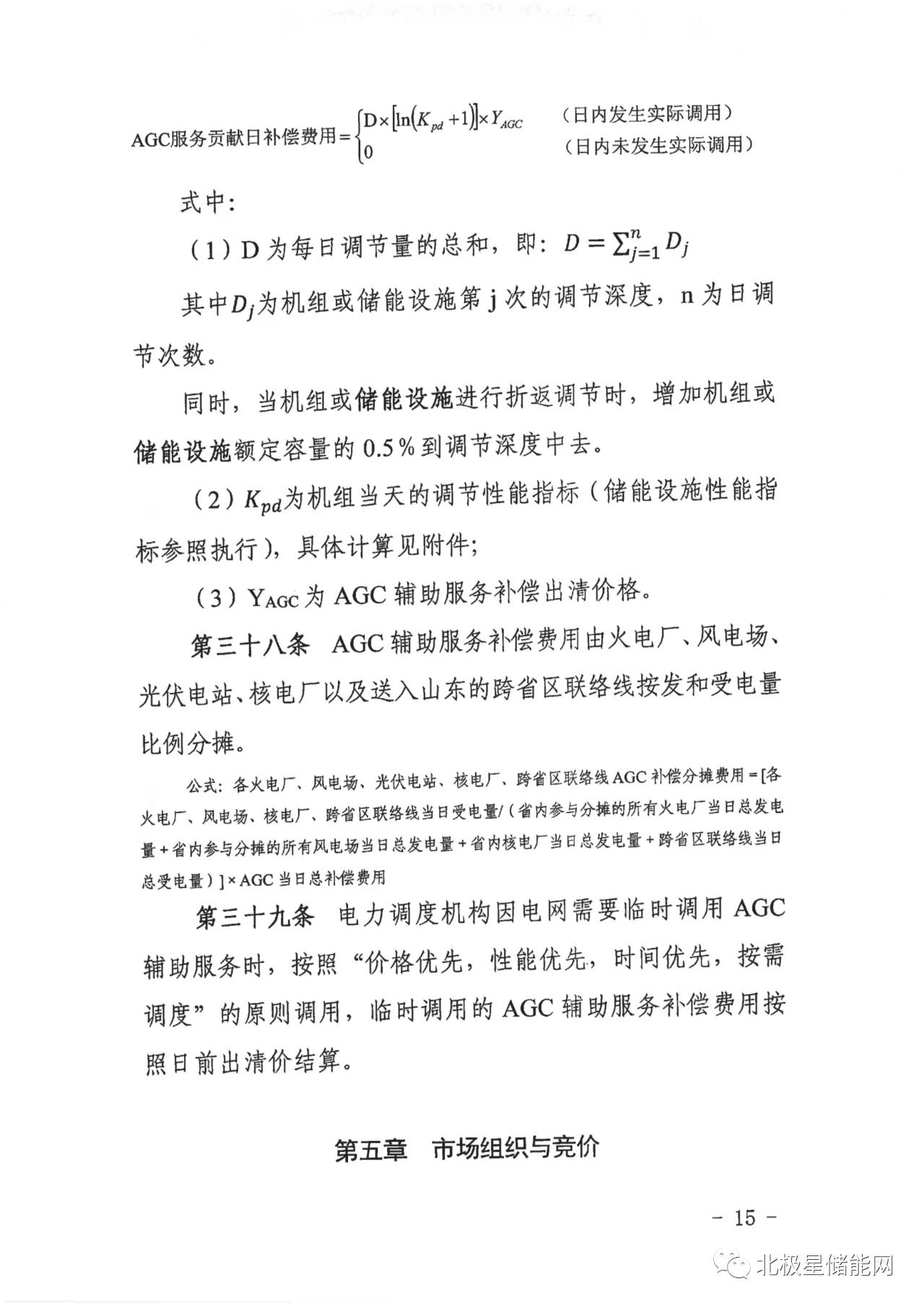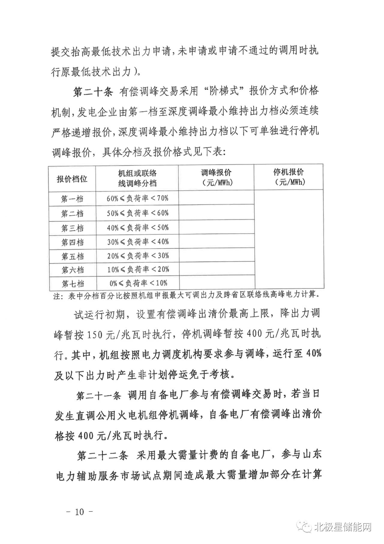 储能设施参与山东电力辅助服务市场,其充放电量的电价、结算按照国家有关规定执行。调用储能设施参与有偿调峰时,若当日发生直调公用火电机组停机调峰,储能设施有偿调峰出清价格按照400元/MWh执行。储能设施有偿调峰辅助服务补偿费用由风电场、光伏电站、核电厂等按场站共同分摊。有偿调峰交易机组调用时,火电机组因参与调峰出力运行至50%及以下时,优先调用储能设施。