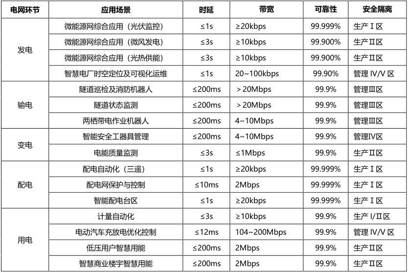 智能电网覆盖发电、输电、变电、配电、用电5个关键环节,各环节需要部署几十种智能电网通信业务,而且各业务的SLA需求,例如时延、带宽、安全隔离等差异较大。根据电网业务的作用及安全隔离的要求,电网业务又分为生产控制大区、管理信息大区两大类业务。其中在生产控制大区中,分为安全I区和安全II区,安全I区业务直接实现对电力系统的实时监控,安全II区业务只检测,无控制;在管理信息大区中,分为管理III区和管理IV/V区,主要对电力生产、电网企业内部进行管理,如视频监控、信息化办公。