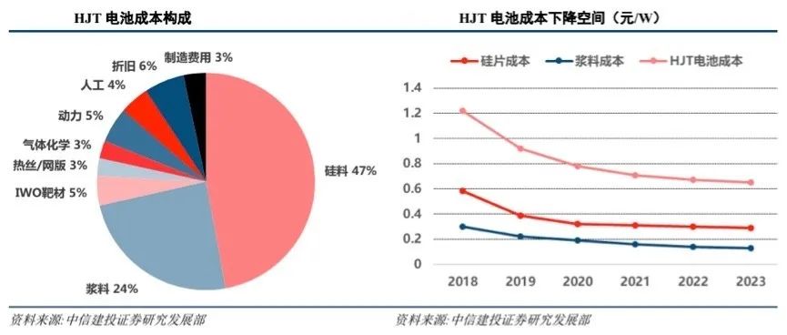 HJT电池成本主要包括自硅料、浆料、折旧和靶材,分别占总成本的47%、24%、6%和5%。中信建投证券发布的研报称,HJT电池的硅料成本可通过减薄硅片的方式下降,未来减薄空间约为45%;浆料成本的降低空间主要来自减量和降价,未来减量空间为40%、降价空间为30%;折旧成本主要来自设备投资,目前进口设备整线投资水平超过 8 亿元/GW,全部国产化后成本预计将降至 5 亿元/GW。