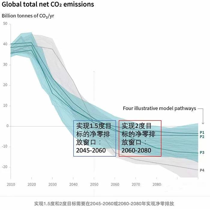 根据联合国政府间气候变化专门委员会(IPCC)研究指出,实现2摄氏度目标需要在2070年左右实现温室气体净零排放,实现1.5摄氏度目标需要在2050年左右实现净零排放,且在实现净零排放后要进一步实现负排放,将大气中的温室气体吸收一部分,以减轻温室效应。