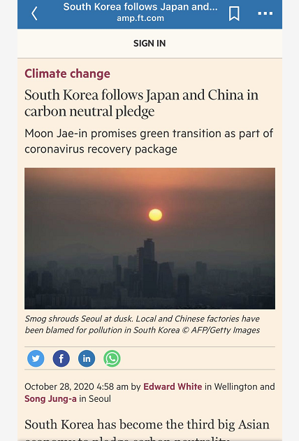 外媒报道,韩国紧随中日两国宣布碳中和目标
