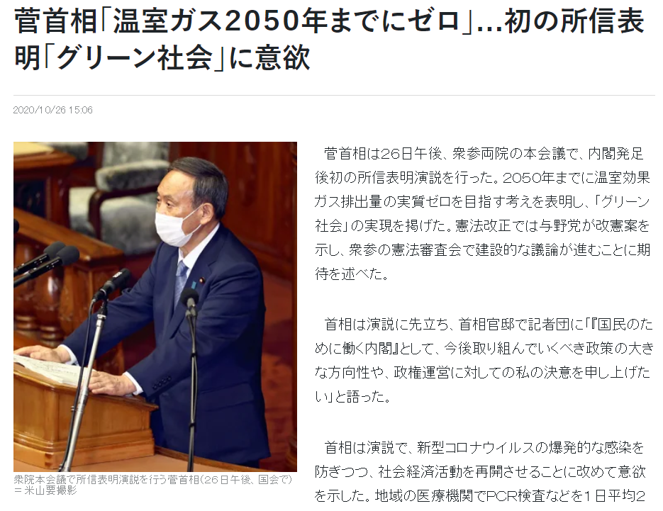 10月26日,日本首相菅义伟宣布2050年“净零排放”