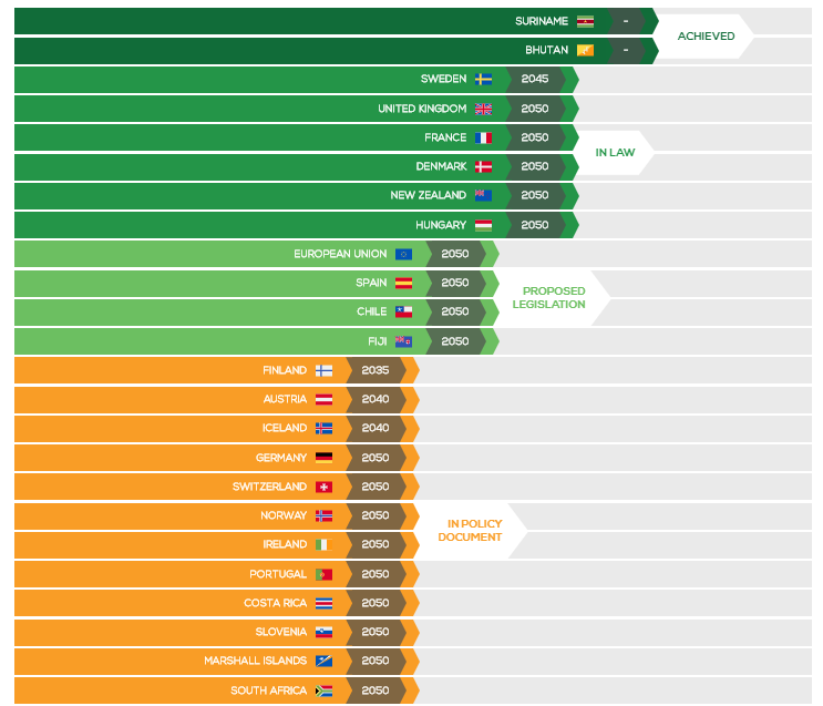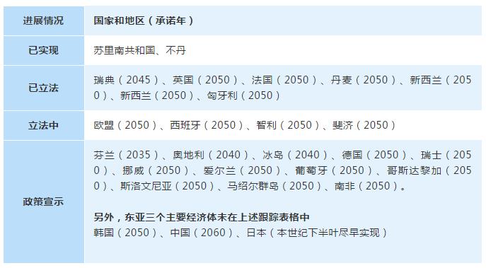 此前,Energy & Climate Intelligence Unit 机构统计了数十个国家和地区提出的“零碳”或“碳中和”的气候目标。其发布的净零排放跟踪表统计了各个国家的进展情况,包括:已实现的2个国家,已立法的6个国家,处于立法中状态的包括欧盟(作为整体)和其他3个国家。另外,有12个国家(包括欧盟国家)发布了政策宣示文档。但东亚三个主要经济体中国、日本和韩国未包括在其跟踪表格中。