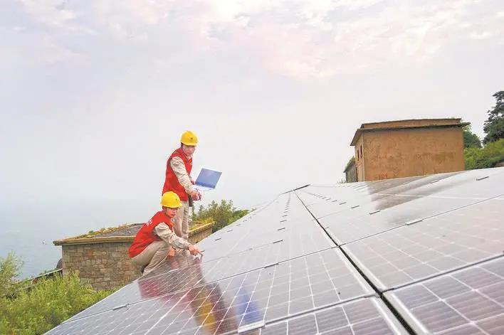 国网江苏电力组织国内气象、地质、水文等方面的专家,梳理分析开山岛区域的历史气象数据,根据数据结果重新设计光伏板的安装方式,在保证足够发电效率的基础上,将光伏板安装角度设置为2.2度。光伏板安装完成后,从远处看与岛上建筑的屋顶浑然一体,丝毫没有影响建筑和开山岛整体外观。