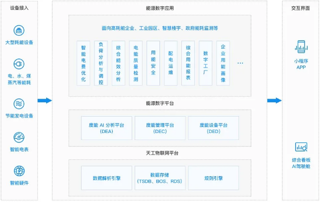 百度旗下的度能-AIOT综合能源共创平台,基于百度ABC+IOT技术助力工业企业、用能园区等进行深入能源信息化改革。提供用电设备接入、负荷预测、电能质量监测、能效优化等30余种数字能源应用,极大地降低企业用能成本、提高企业用能安全性,提升能源使用效率。