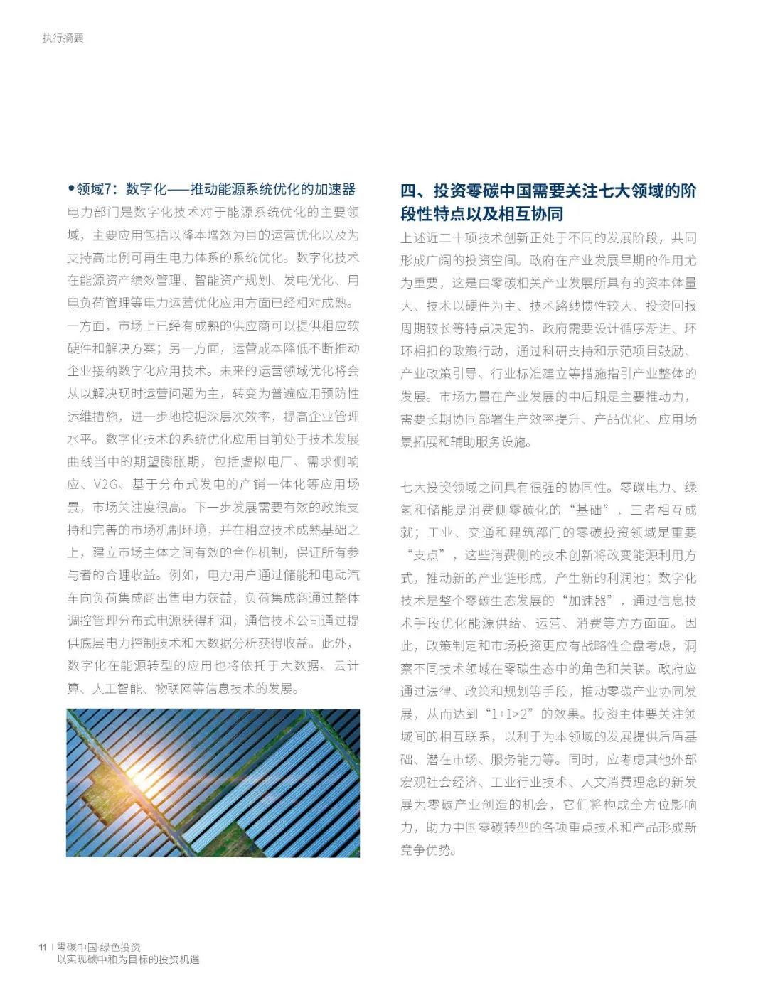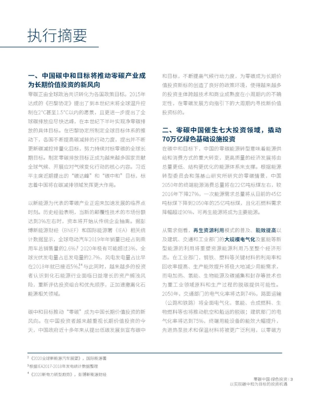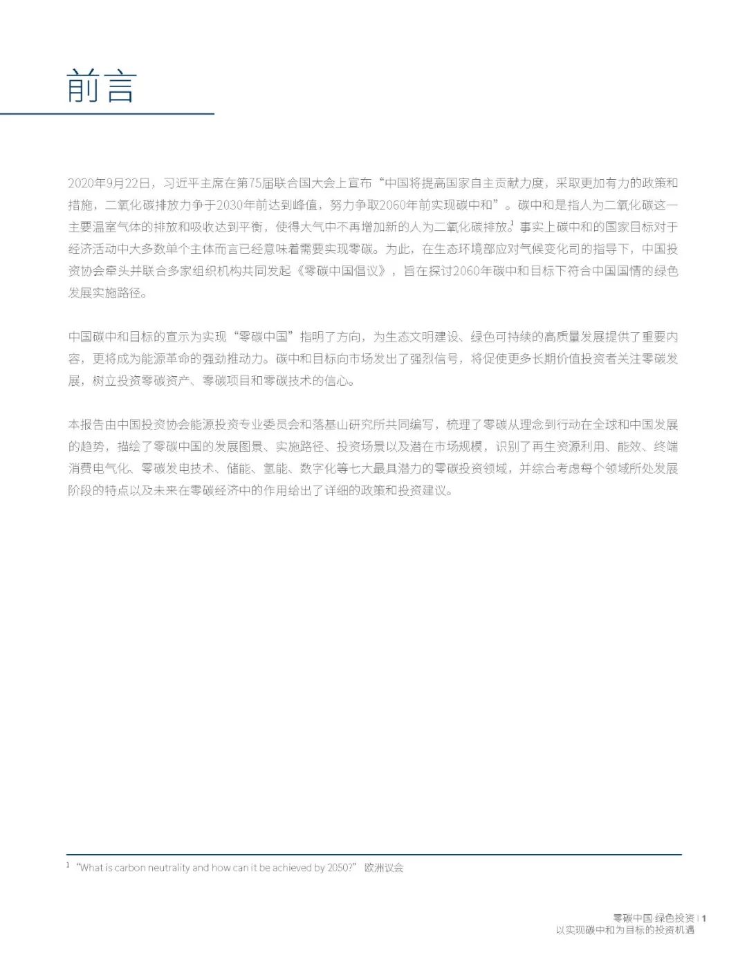11月8日,在中国投资协会主办的进博会新基建绿色投资大会上发布了《零碳中国·绿色投资蓝皮书》执行摘要。本报告由中国投资协会能源投资专业委员会和落基山研究所共同编写,梳理了零碳从理念到行动在全球和中国发展的趋势,描绘了零碳中国的发展图景、实施路径、投资场景以及潜在市场规模,识别了再生资源利用、能效、终端消费电气化、零碳发电技术、储能、氢能、数字化七大最具潜力的零碳投资领域,并综合考虑每个领域所处发展阶段的特点以及未来在零碳经济中的作用给出了详细的政策和投资建议。