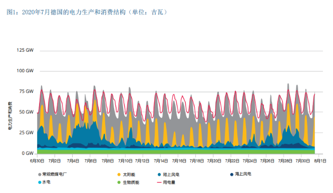 通常情况下,可再生能源的比例不断提高,每小时发电 量变化会增加。但是,波动幅度和对灵活性的需求取决 于可再生能源类型以及不同可再生能源技术的组合。光 伏电站非常适合太阳能辐射充足的地区,并且光伏并网 具有日波动和季节性波动特征。风电并网量与风速呈高 度相关关系,在各种可再生能源类型当中,风电每小时 并网曲线是最不规律的。因此,风电场和光伏电站的并 网量很难预测,所以电力系统中发电计划在很大程度上 取决于并网量预测,而并网量预测应尽可能做到精确无 误。但是,即使预测水平有所提高,仍然需要灵活性技 术,以便快速增加或减少发电量或用电需求。然而,也 有一些非波动性可再生能源。在世界范围内,水电是一 种非常普遍的可再生能源,发电出力几乎恒定。不过, 在一些夏季气候干燥的国家,水电的季节性波动比风电 大(葡萄牙风电相当稳定,但水电在夏季波动很大)。 生物质能可控性很好,如今在欧洲和北美得到广泛使 用,地热和太阳能热电厂与储能相结合也可以保证电力 供应恒定,不同技术的组合使用会决定最终的发电模 式,并决定在平衡波动时采用何种技术或概念。图1 显 示了2020年7月德国每小时的发电量,从中可以清楚地 看到陆上风电和光伏的波动性。在德国的能源结构中, 可再生能源占比达到43%(图2);到2030年,预计这一 比例将超过65%,到2050年,电力系统基本全部使用可 Figure 1 再生能源。