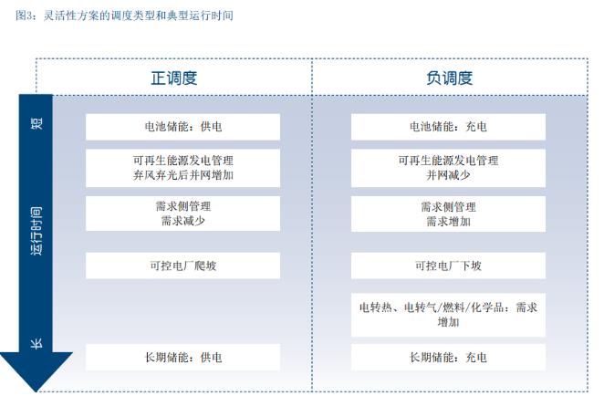 提升能源系统的灵活性有多种方案。表2列出了这些方 案,并简要说明了方案目标。显然能够满足灵活性需求 的方案不止一种。大多数情况下,不同能源系统会有不 同需求,因此,平衡供需需要综合运用多种方案。储能 是众多方案中的重要一类,其中包括部门耦合方案。 一些应用情景需要快速响应,因此需要响应时间短的 技术。然而在其他情况下,则需要保证灵活性提供的 持续时间,因此这些灵活性方案必须具有运行时间长、 效率高的特点。在图3中,灵活性方案按典型运行时间 排列。此外,调度方向已给定。正向调度指需求超过供 应,因此必须减少需求或增加供应,以维持系统平衡。 反向调度指供大于求,因此必须减少发电量或增加可控 负荷的需求