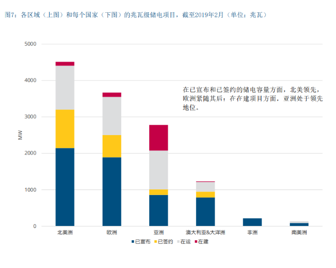 图7展示了截至2019年2月各地区和国家的兆瓦级储电项 目概况(包括在运项目和计划建设项目)。其中,美国领先,其次是欧盟各国(尤其是英国、德国)、澳大利 亚、日本、中国和韩国)。