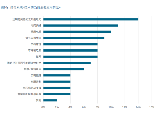 处理风电和太阳能发电造成的电力过剩是利益相关方安 装储电设施的主要原因(图10),但是电网调频和其他 系统服务也是建设储电设施的原因。