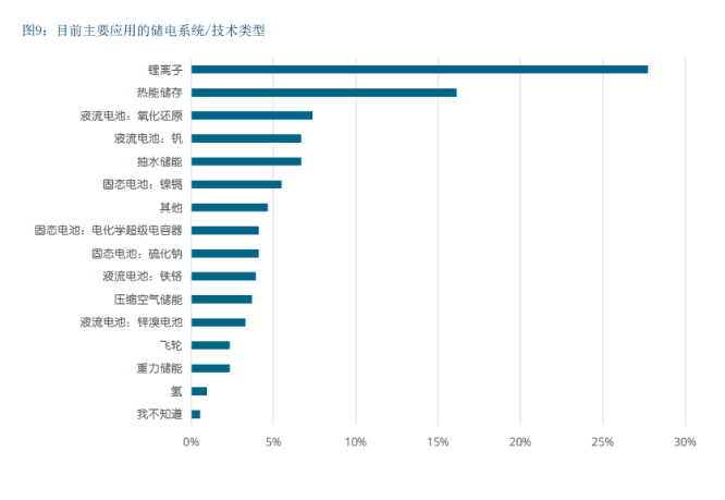 图9显示了锂离子电池在储电中的主要作用,其次是热 储能,特别是集中式太阳能电站+熔融盐储能有所增加。