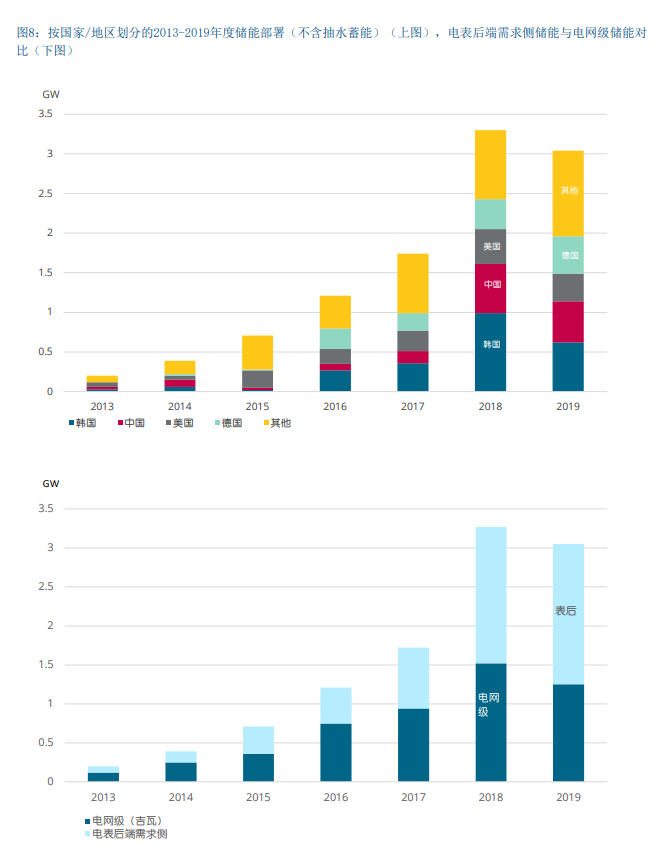 根据国际能源署储能追踪报告[11],2019年以来,储能 系统(不包括抽水蓄能系统)的实际建设量自2019年以 来首次下降(图表8)。值得注意的是,韩国市场受到 技术问题的影响,储能系统建设与安全法规(电池起 火)相冲突。根据国际能源署报告[11],2020年的新冠 疫情危机很可能加剧这些影响,因为电池生产包括从电 池、组件到包装和安装在内的供应链特别复杂。