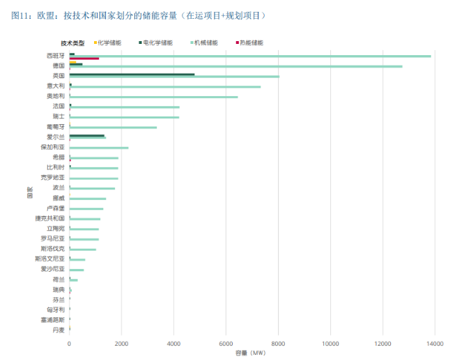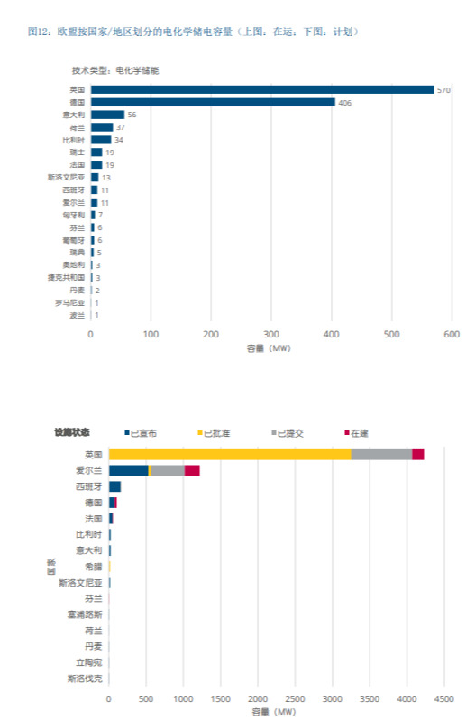 图13对近期欧洲范围内的储能系统进行了概述,并建立 了欧洲储能设施详细信息数据库。其中显示,欧盟的大 部分储能(占现有功率的90%以上)属于抽水蓄能(图 11中的浅蓝色部分),具有容量大和功率大的特点。机械储能达8万兆瓦,其中近5万兆瓦处于在运状态,其余 处于规划或建设阶段。此外,还包括约1500兆瓦的非常 规储能方案,例如压缩空气储能。电化学储能规模累 计达8000兆瓦,其中约1200兆瓦处于在运状态,处于规 划/建设阶段的电化学储能为6000兆瓦(图12)。已取 消700兆瓦,未在图中列出。在在运电化学储能系统方 面,英国和德国处于领先地位;在规划储能容量方面, 爱尔兰和西班牙颇为突出。该分析及图14还表明,表后 储能在进一步增长(图8和图13)。