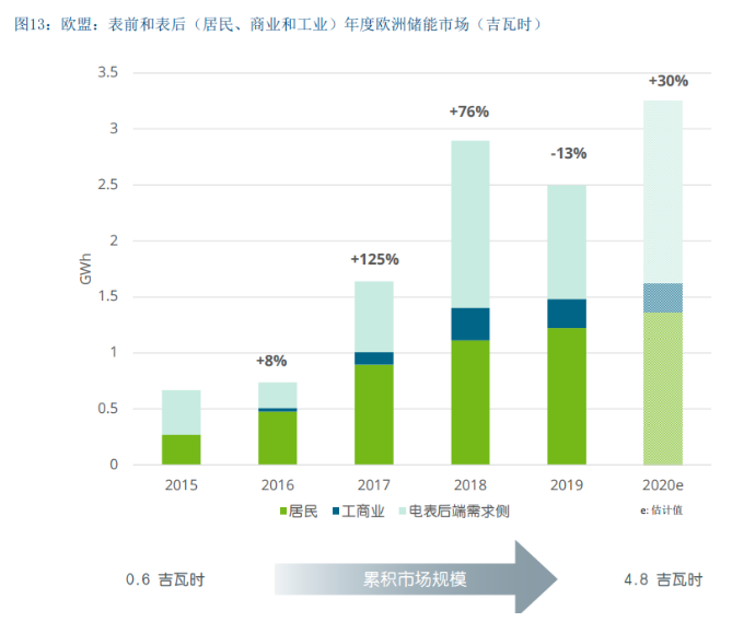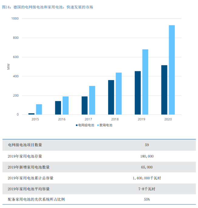 在德国,电网级电池和家用电池正在迅速发展,后者的 甚至发展更快(图14)。请注意:2019年和2020年的数 字是预测值,并不反映最新的发展情况。大型电池发展 的主要驱动力是因为它们有益于一次备用市场(见4.3 节例子)。由于一次备用市场价格下跌(使得这些市场 暂时对于投资者的吸引力下降),“表前”应用目前有 所放缓。