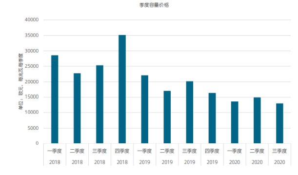 在一次备用市场中使用储电的主要动力是:一次备用的 容量价格高。2018年德国季度支付的一次备用容量价格 达每季度35000欧元/兆瓦(每年14000欧元/兆瓦),但在2020年降至每季度不到15000欧元/兆瓦(每年60000 欧元/兆瓦)(图15 )。