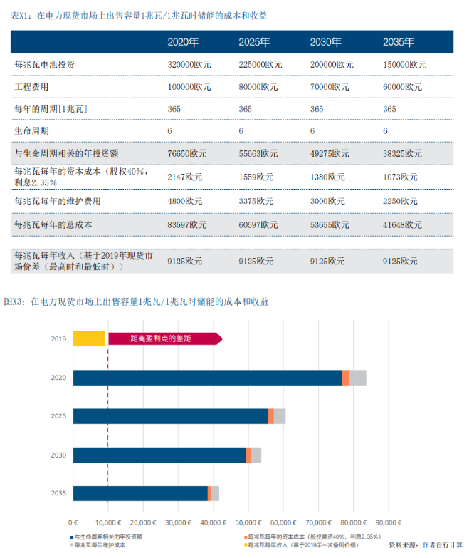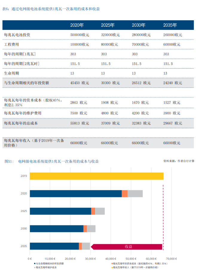 15兆瓦/20兆瓦时大型电池的成本估算在400至600欧元/ 千瓦时之间,整个系统的总投资为800万至1200万欧元 (大约每兆瓦约60万欧元,请参阅表6)。按照当前的 投资水平,年度总成本(包括保养成本和资本成本)将达到55000欧元,如果可以降低电池成本,到2035年, 成本将有所下降。根据2019年调频备用的收益(每年 每兆瓦约66000欧元),投资这种电池系统是有利可图 的。
