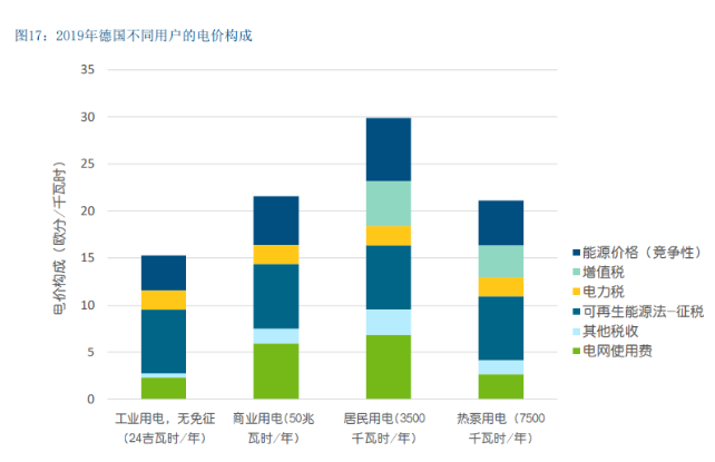 通过部署电池系统优化光伏自发自用的一大动因是,相 比于从电网购电而言,用户用电成本可以降低。2019年居民终端用户一般购电价格为30欧分/千瓦时,其中也 包括高比例的税费(见图17)。