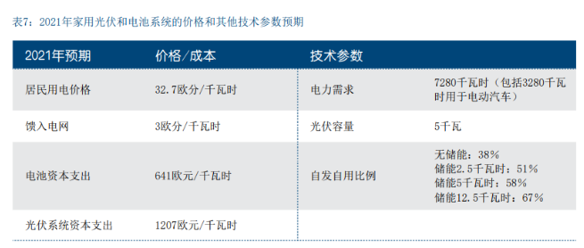 在电池系统成本大幅下降至不到700欧元/千瓦时的背景 下,到2021年,与未部署电池的系统相比,部署电池系 统的总用电成本较低。一个电力需求4000千瓦时的普通 家庭,加上一辆电动汽车3280千瓦时的额外用电需求, 每年需要支付2375欧元的电费(见表8)。对于这样的 家庭来说,安装5千瓦的光伏系统是有利可图的,因为与从电网购电相比,自发自用的用电成本更低,每年的 电费将减少到2030欧元。自用剩余的3100千瓦时的电力 以3美分/千瓦时的低价送入电网。使用电池储能增加自 发自用的比例,每年可将居民家庭电费减少到2012欧 元。