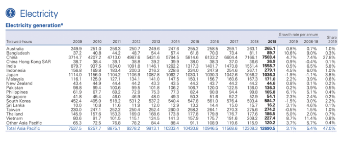 (附加:截至2019年,文莱发电量达4,450吉瓦时、柬埔寨发电量达8,675吉瓦时、老挝发电量达34,410吉瓦时、缅甸发电量达2,159吉瓦时)