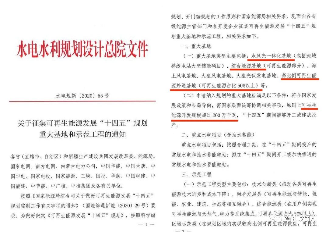 2020年5月,水规总院曾下发文件,要求各省申报可再生能源重大基地,包括: