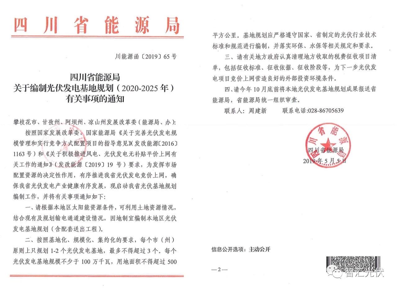 2019年11月,四川省能源局下发《关于编制光伏发电基地规划(2020-2025年)有关事项的通知》,拟在甘孜、阿坝、凉山州及攀枝花市启动光伏基地编制规划工作,按照基地化、规模化、集约化的要求,每个市(州)原则上只规划1-2个光伏发电基地,最多不超过3个,每个光伏发电基地规模不少于1GW。