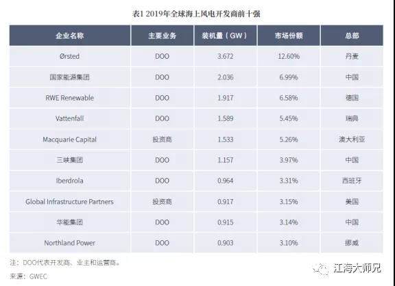 2019年全球海上风电开发商Top10