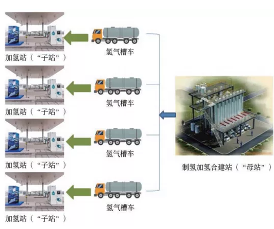 目前,国内多数长管拖车均用来装载压缩天然气(CNG)陆路运输,通过长管拖车运输高压气态氢随着氢能应用的不断深入也开始成为一种新趋势,目前通用的长管拖车高压钢瓶工作压力为20MPa。据悉,2020年内,国家将针对30MPa气态氢长管拖车运输方式下发许可,这将大大提高长管拖车的装载量,从而提高其经济性。从而有力推动制氢加氢“子母站”中“母站”与“子站”之间运输距离的扩大,制氢加氢“子母”站的经济性得到大幅度提高。