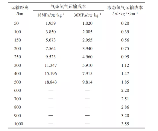 注:①气态氢气运输,设定条件为长管拖车水容积25.9m3、满载高压18MPa、卸载后低压5MPa,单台单次运输氢气3360m3,即306kg;长管拖车水容积25.9m3,满载高压30MPa,卸载后低压5MPa;单台单次运输氢气6470m3,即577kg。②采用长管拖车为日加氢量为500kg的加氢站输送氢气,30MPa输氢压力条件下,每天需要1趟才能满足加氢站用氢需求。