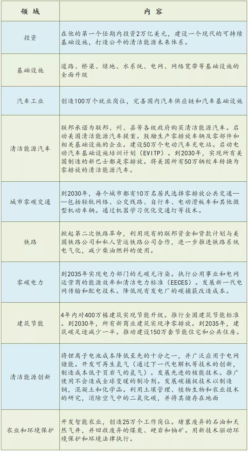 如上表所示,拜登的绿色新政希望依托技术创新、需求激发、基础设施投资三大支柱,意在让美国经济流淌清洁能源的血液。