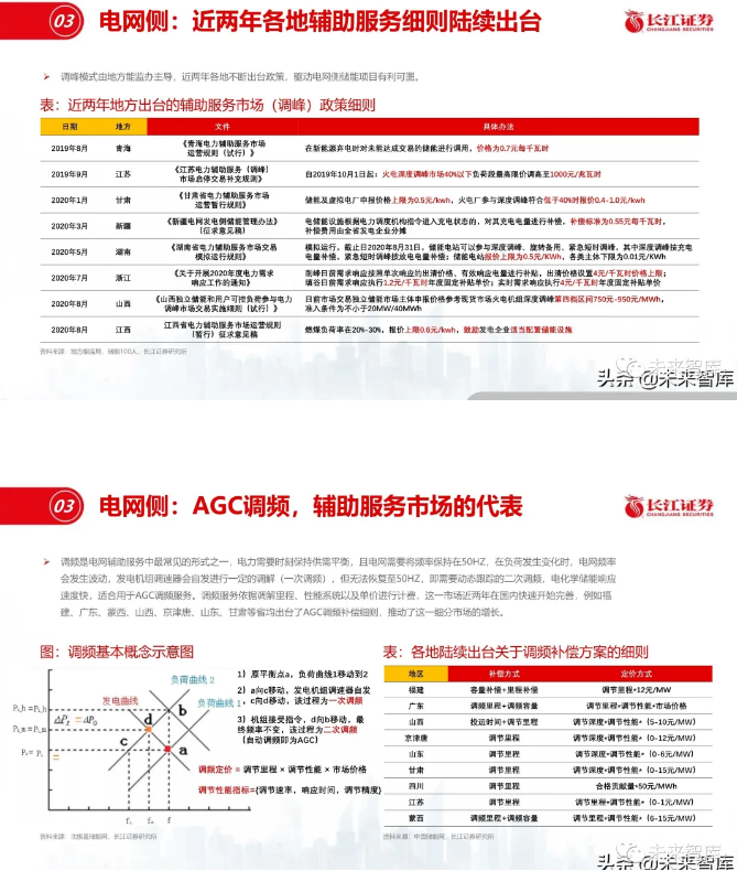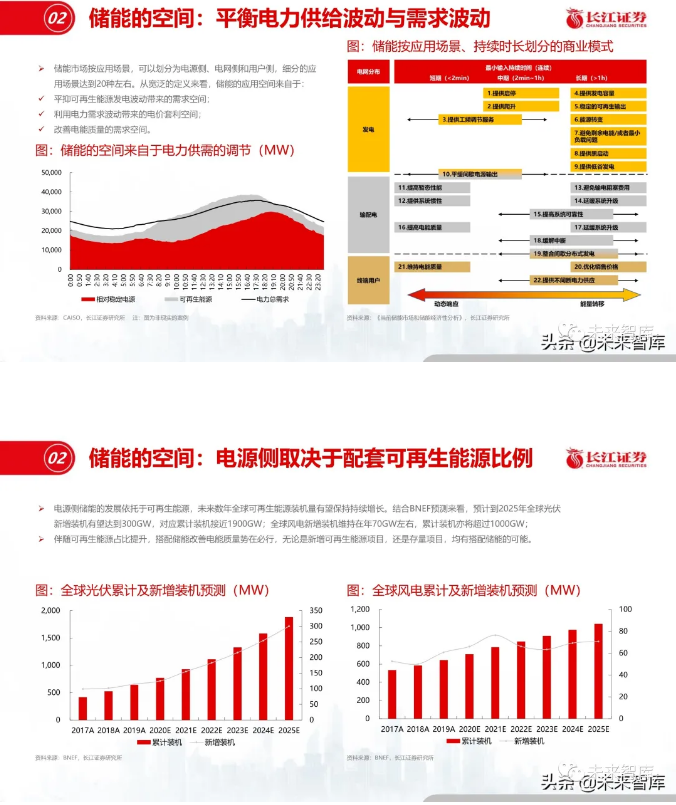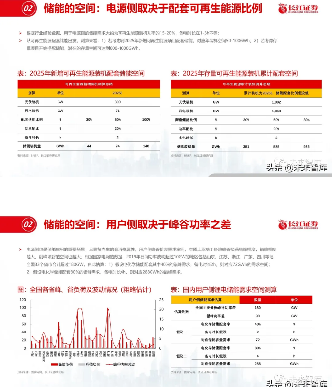 根据行业经验数据,用于电源侧的储能需求大约为可再生能源装机功率的15-20%,备电时长在1-3h不等;从可再生能源配套储能出发,测算来看:1)若考虑到2025年新增可再生能源项目配套储能,对应年装机空间50-100GWh;2)若考虑存量项目开始搭配储能,潜在的存量空间可达到600-1000GWh。