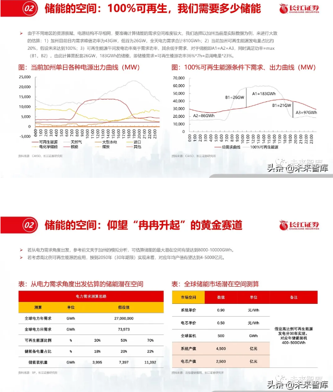 由于不同地区的资源禀赋、电源结构不尽相同,要准确计算储能的需求空间难度较大,我们选择以加州当前是实际数据为例,来进行大致 的估算:1)加州目前日内需求峰值功率为43GW,低谷为26GW,全天电力需求合计810GWh;2)当前加州可再生能源发电量占比约 20%,假设未来达到100%;3)可再生能源午间发电功率高于需求功率,其余低于需求,对于储能即A1=A2+A3,同时满足功率=max (B1,B2),由此计算需配套26GW,183GWh的储能,即储能需求=可再生能源功率36%*7h=总用电量*23%。