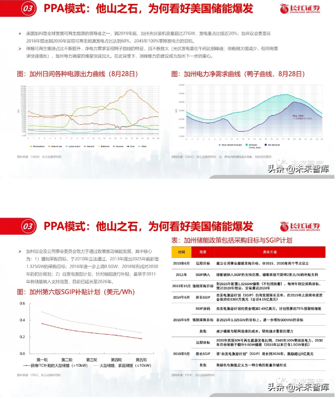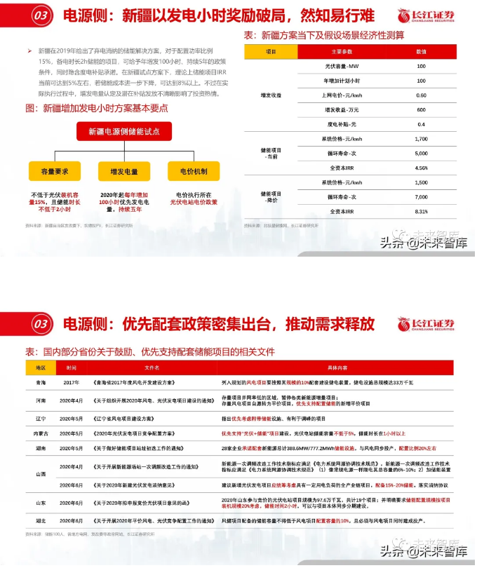 相比于美国市场(尤其是加州)已经寻找到合适的商业模式,国内目前仍处于摸索阶段,无论是“发电小时奖励”还是“优先配套”,都 难以理顺储能的收益模式(发电小时奖励难以覆盖投资成本)和价值认定(优先配套导向价格竞争)。