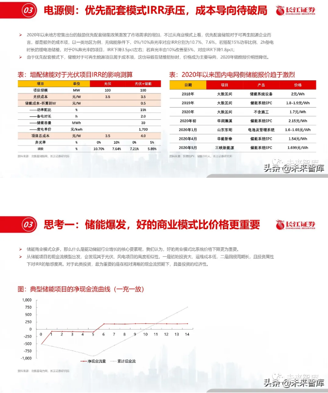 从储能项目的现金流模型出发,会发现其于光伏、风电项目的高度相似性,一是初始投资大、运维成本低,二是回报周期长,且投资属性下对IRR的敏感度高。对于此类投资,最为重要的是在相对清晰的现金流预期下,具备投资的经济性。