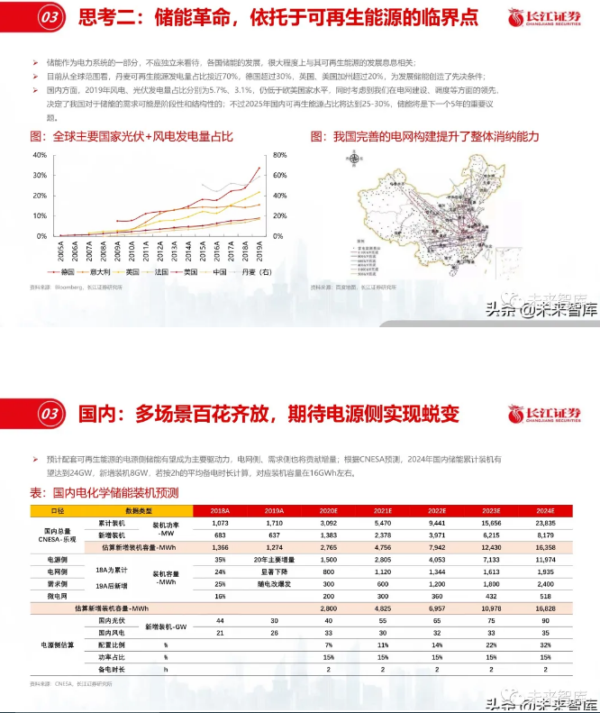 国内方面,2019年风电、光伏发电量占比分别为5.7%、3.1%,仍低于欧美国家水平,同时考虑到我们在电网建设、调度等方面的领先,决定了我国对于储能的需求可能是阶段性和结构性的;不过2025年国内可再生能源占比将达到25-30%,储能将是下一个5年的重要议 题。