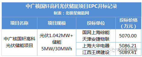 11月25日,中广核国轩高科储能光伏项目设计采购施工工程总承包中标候选人公示,第一中标候选人为国网上海综合能源服务有限公司与天津安捷物联科技股份有限公司的联合体,投标价格约为5070万元。此外第二中标候选人为上海大华电器设备有限公司,第三中标候选人为江西王牌建设工程集团有限公司。