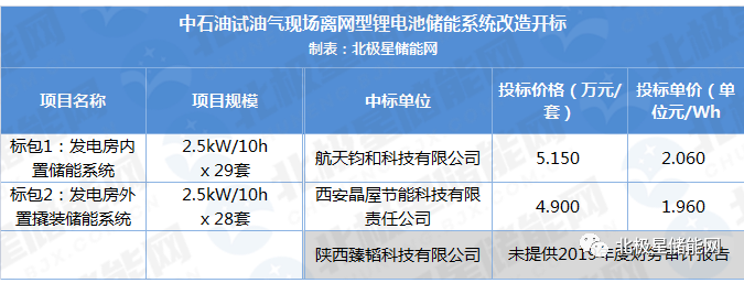 试油气现场离网型锂电池储能系统改造项目共分两个标包,分别需采购2.5kW/25kWh储能系统29套和28套,最高限价分别为156.6万元和159.6万元。结果显示航天钧和科技有限公司和西安晶屋节能科技有限责任公司获得中标,两者投标单价约2.06元/Wh和1.96元/Wh。