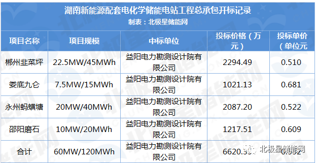 11月26日,湖南郴州韭菜坪等四个新能源配套电化学储能电站工程总承包开标,结果显示四个项目中标候选人均为益阳电力勘测设计院有限公司,四个项目总投标额达6620万元。此次招标不包含储能电池等核心设备。