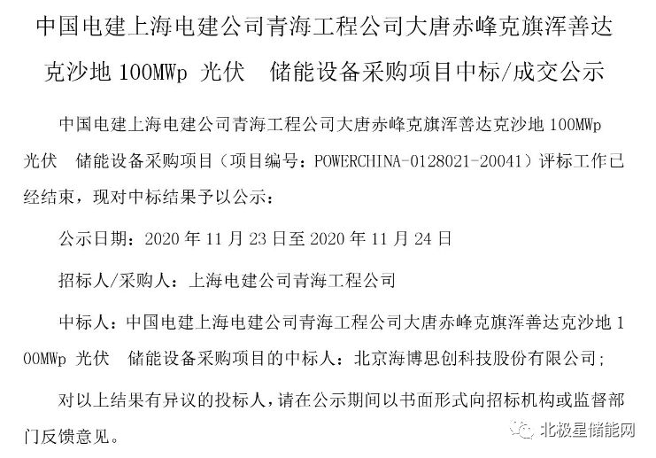 中国电建上海电建公司青海工程公司大唐赤峰克旗浑善达克沙地100MWp光伏储能项目储能设备采购中标公示,北京海博思创科技股份有限公司获得中标。