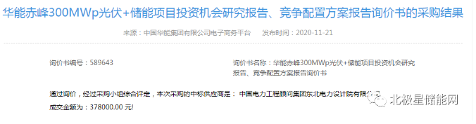 中国电力工程顾问集团东北电力设计院有限公司中标华能赤峰300MWp光伏+储能项目投资机会研究报告、竞争配置方案报告采购,中标价格为37.8万元。根据内蒙古文件5%的配置比例要求,预计储能规模约15MW/15MWh。