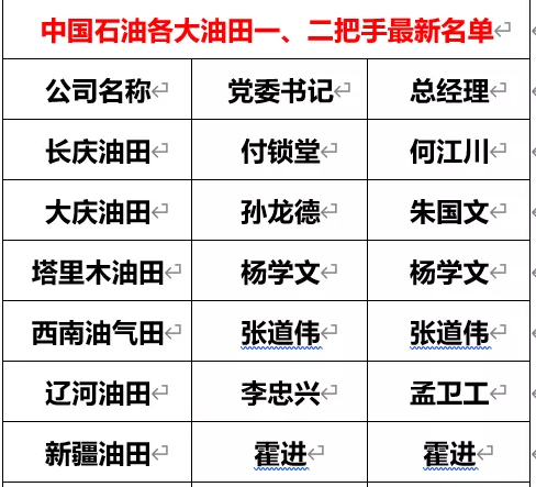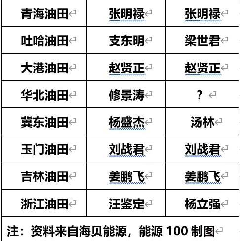 经过这轮人事调整后,中石油下属14家油田领导班子焕然一新。据“海贝能源”所作统计,中国石油各大油田一、二把手最新名单如下: