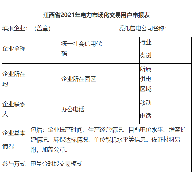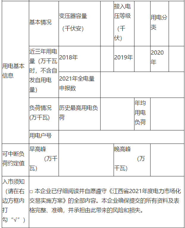 (三)市场主体注册和交易方式确定:参加2021年年度交易的市场主体应于年度交易闭市前在江西电力交易平台完成市场注册、明确参与时段交易或常规交易、签订信用承诺书;2021年起,参加月度交易的市场主体应于月度交易开市前完成市场注册、签订信用承诺书,当月新增的市场主体可参加次月月度交易。各市场主体应及时签订电力中长期交易合同。