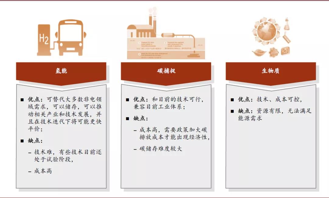 ►氢能可能是最终解决方案。我们认为要实现能源最终的能源碳中和必须在非电领域推动新的技术发展和应用,目前来看主要有三个解决方案,分别是氢能源、碳捕捉和生物质。但是考虑到生物质资源上的限制,以及碳捕捉对于政策要求,氢能在产业发展,技术迭代上优势更强,因此更有可能是最终解决方案。