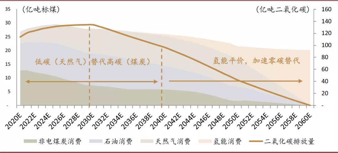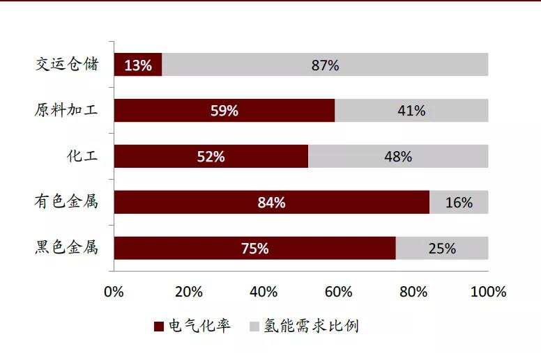图表: 几个主要板块的电气化率预期以及预期氢能需求贡献比例(2060年)