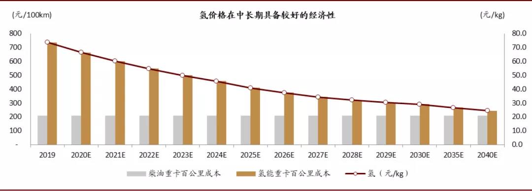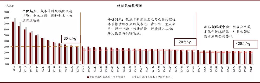 我们认为随着燃料电池终端应用的起量,终端氢价格可由目前的70-80元/kg(含税)下降至2025年的约35-40元/kg(含税),并至2030年下降至约30元/kg(含税)。