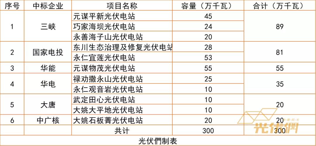 日前,云南3GW光伏项目初步中标结果出炉,三峡、国家电投、华能、华电、大唐、中广核等中标了本次遴选的11个光伏电站项目,具体结果见下。