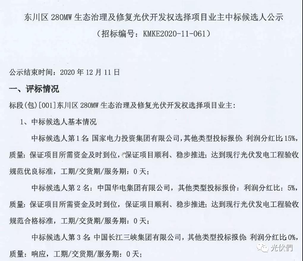昆明东川区光伏项目优选中标企业公示