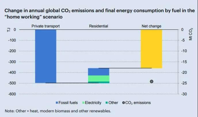根据国际能源署发表的《2020年能源效率报告》,在家工作可以导致节能减排。在家工作一天可以减少开车上下班的时间和燃料,从而减少能源消耗和二氧化碳排放。然而,对于那些通常只乘汽车短途通勤或主要乘坐公共交通工具的工人来说,在家工作可能会导致能源需求和较高住宅能源使用的排放量的净增加,具体取决于住宅燃料结构。