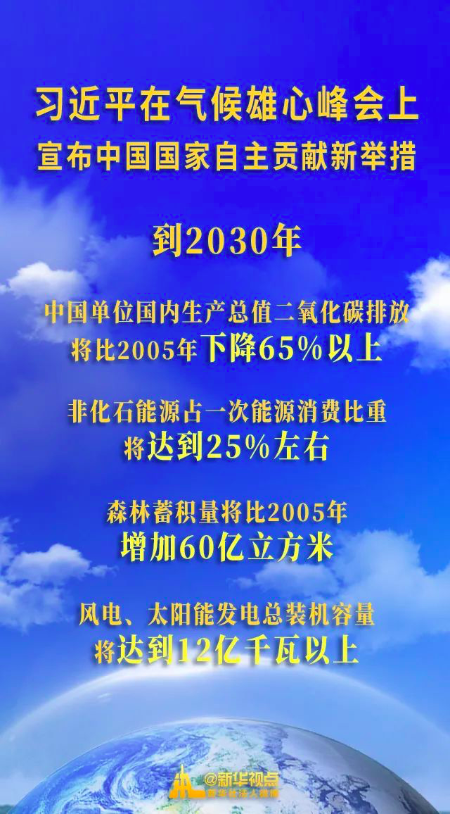习近平强调,中国为达成应对气候变化《巴黎协定》作出重要贡献,是落实《巴黎协定》的积极践行者。中方已经宣布将提高国家自主贡献力度,我愿进一步宣布:到2030年,中国单位国内生产总值二氧化碳排放将比2005年下降65%以上,非化石能源占一次能源消费比重将达到25%左右,森林蓄积量将比2005年增加60亿立方米,风电、太阳能发电总装机容量将达到12亿千瓦以上。中国历来重信守诺,将以新发展理念为引领,在推动高质量发展中促进经济社会发展全面绿色转型,脚踏实地落实上述目标,为全球应对气候变化作出更大贡献。