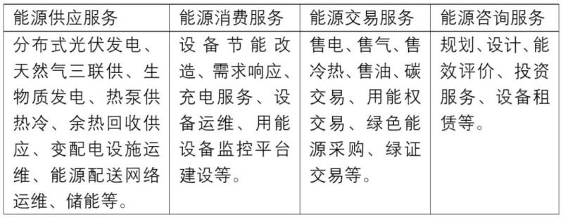 根据目前的产业实践经验,综合能源服务按照客户对象主要分为两类。一类面向园区客户,综合能源服务的“综合”侧重体现在提供不同品类能源的服务,最终的形态是集成在一起。多能源品种包括冷、热、电、气等。另一类是面向个体客户,例如工业企业、酒店、学校等单一决策主体,“综合”侧重体现在提供不同专业领域的能源服务,最终的形态是组合在一起。多专业领域包括能源供应服务、能源消费服务、能源交易服务、能源咨询服务等。各类包含的技术和业务如下表所示。笔者总结综合能源服务的内涵是指以满足客户与能源相关的安全、经济、环保、品质等综合需求为导向,为客户提供的综合多能源品种或者综合多专业领域的能源服务。