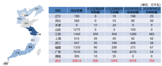 数据统计,截止2020年9月,辽宁、河北、天津、山东、江苏、上海、浙江、福建、广东、广西、海南等沿海地区已核准海上风电项目超90GW。